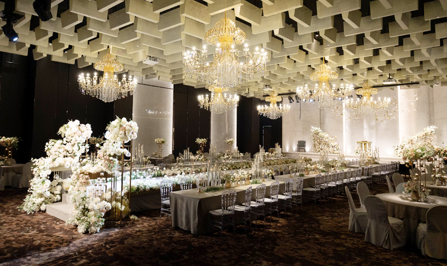그랜드 볼룸/8미터의 웅장한 천장과 모던한 아트 글라스 벽면 장식의 세련되고 품격있는 첫 출발 공간을 연출해 드립니다.